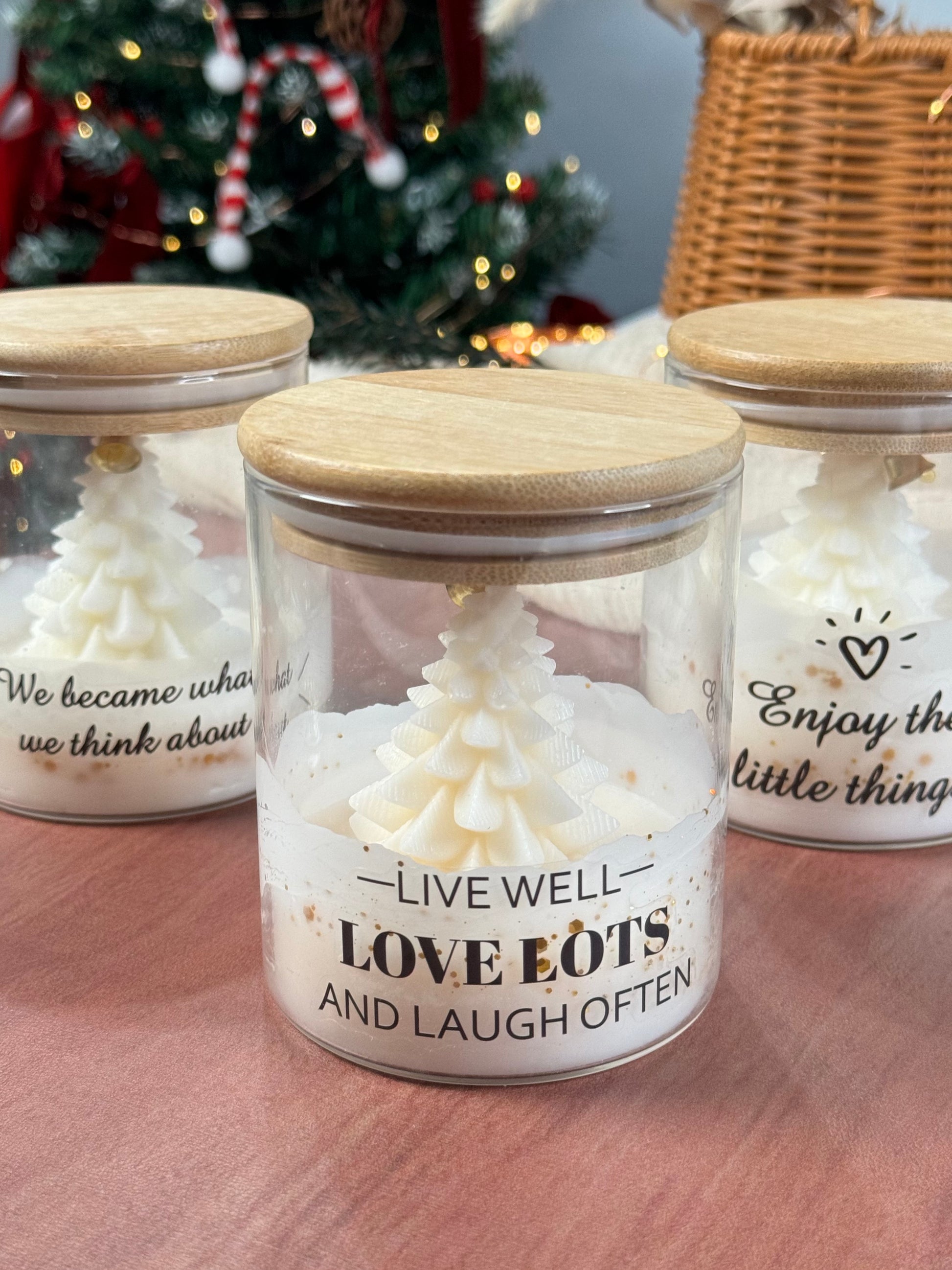 A small Christmas scene captured in a clear glass — this hand-poured candle features a sculpted white Christmas tree standing quietly at the center, creating a warm holiday atmosphere even before it is lit. The soft color palette and clean details make it a charming piece of seasonal décor with a playful festive touch.