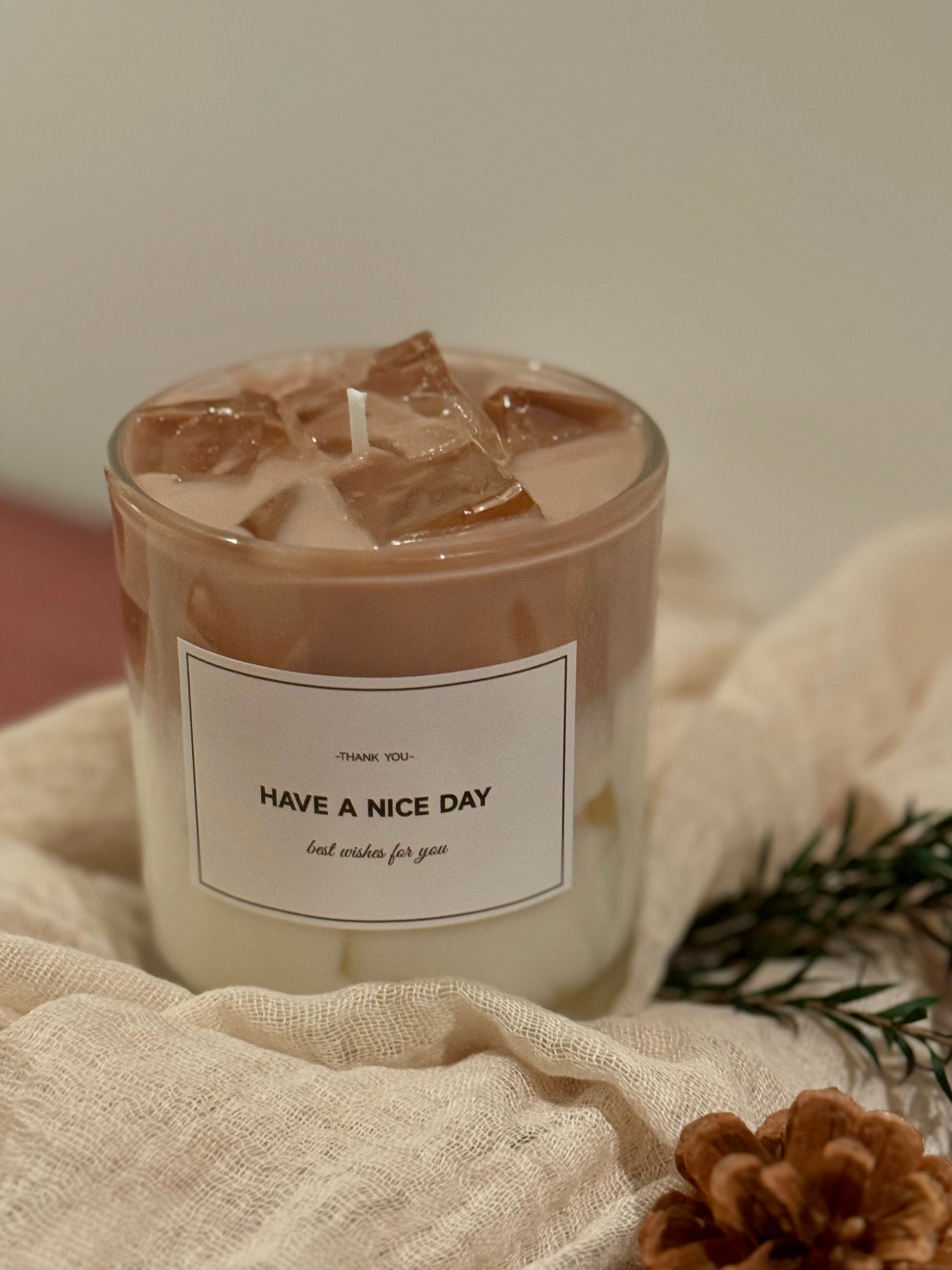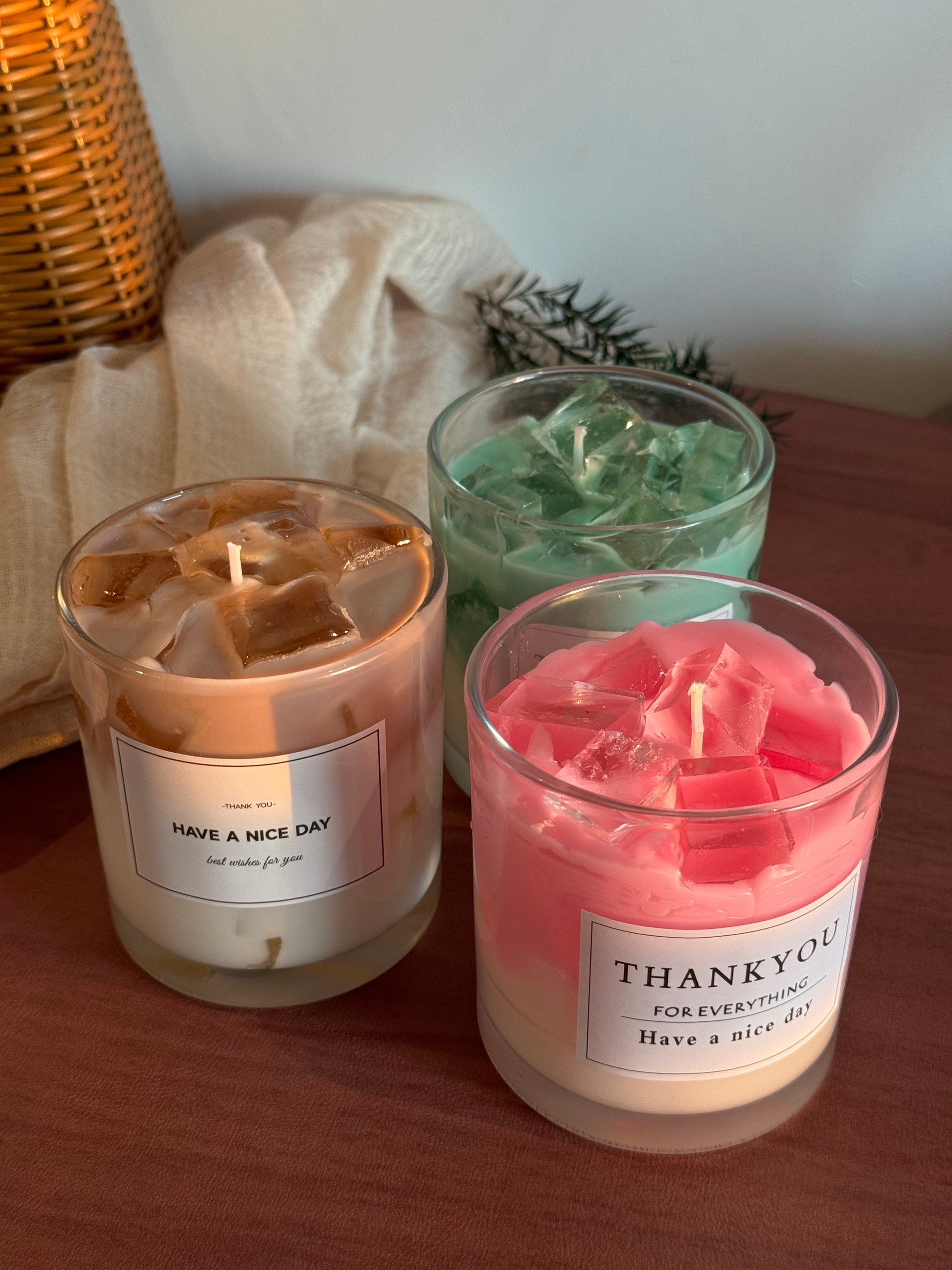 A refreshing twist on classic candle design — this handmade ice cube cup candle features crystal-clear wax cubes that look just like real frozen ice. Each candle is hand-poured with a smooth base layer and topped with glossy translucent blocks, creating a clean, modern, and visually cooling effect.
